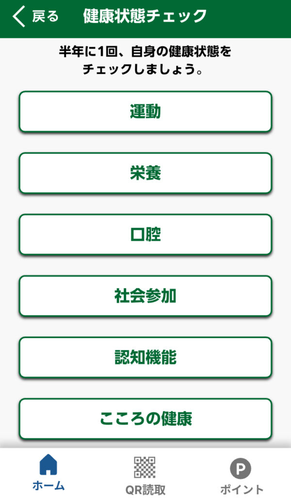アプリを開いて「健康管理」→「健康状態チェック」と進むと、「運動」「栄養」「口腔」「社会参加」「認知機能」「こころの健康」の6つの項目が出てきます。これらは半年に1回チェックすることができ、各項目のチェックが完了すると25ポイント獲得できます。