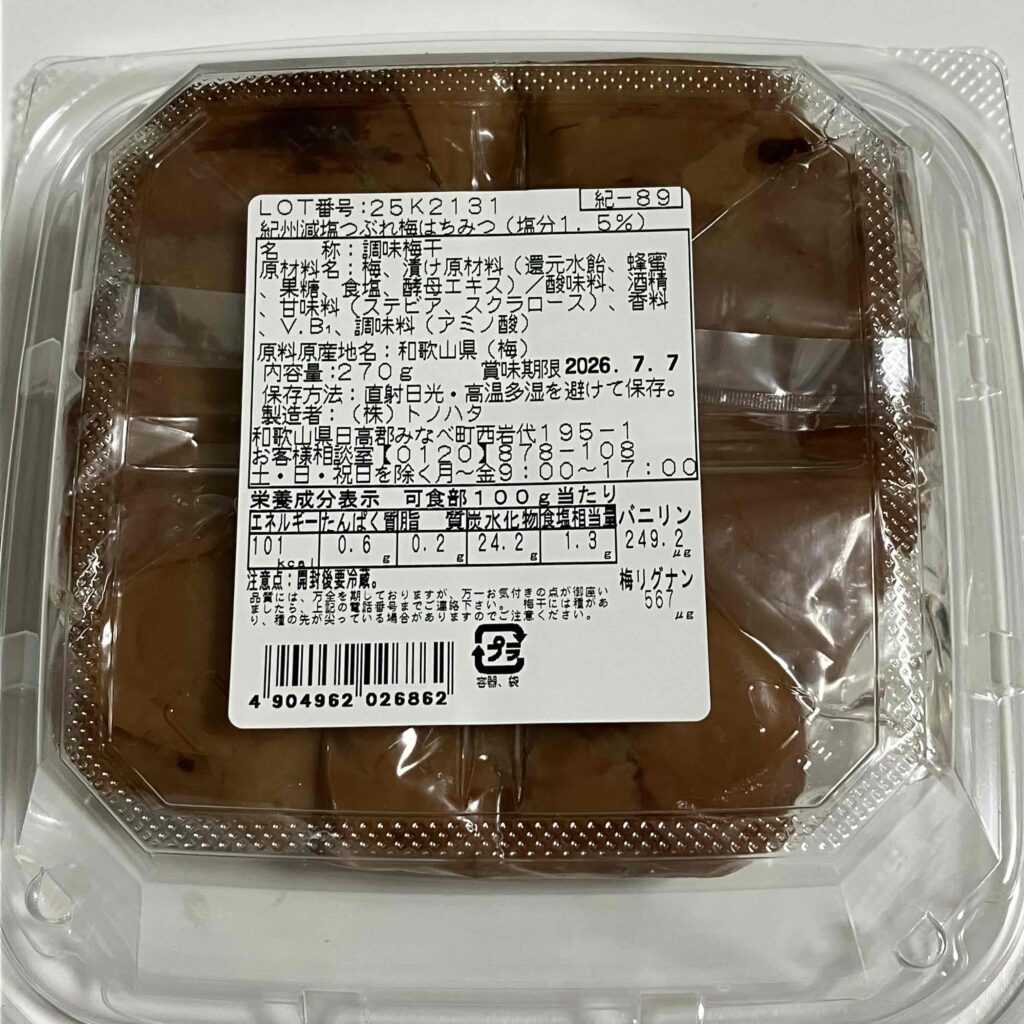 まずははちみつ味の紹介です。といっても、しそ漬味も同じ270gで入っている梅の数も大体12個くらいで同じだったので、違うのは味だけですね。